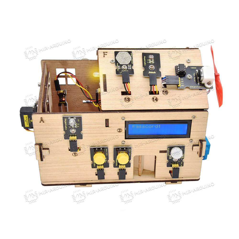 Набор для моделирования Ардуино (Arduino) Smart Home – конструктор для макетирования умного дома в миниатюре. Набор включает в себя корпус будущего домика, а также все необходимые платы, датчики и модули для его автоматизации. На примере конструктора можно понять, как работает освещение, звонок, автоматическое открывание дверей и окон. Управлять всеми системами можно удаленно через свой телефон. Миниатюрный умный дом питается от 6 батареек типа АА, рабочее напряжение составляет 5 В.